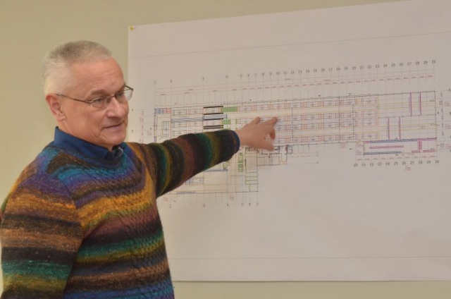 Ražošanas vadītājs Artis Dzelme demonstrē ražotnes plānu.