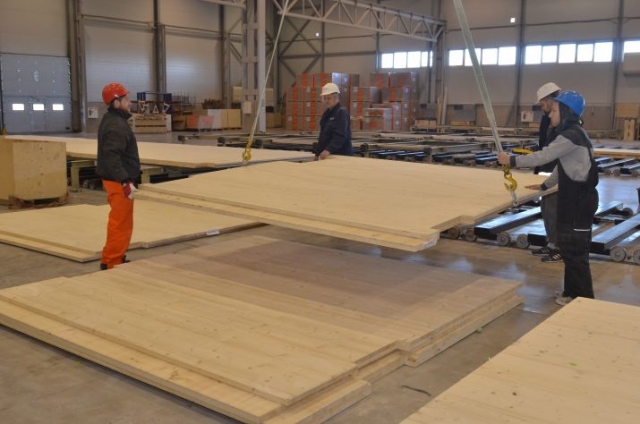 Griestu konstrukcijās tiek izmantots jauns materiāls, kas veidots no dažādos virzienos salīmētām koka brusām. Vīri liek kopā griestu bloku.