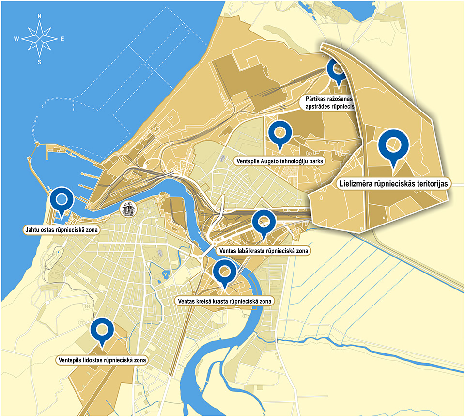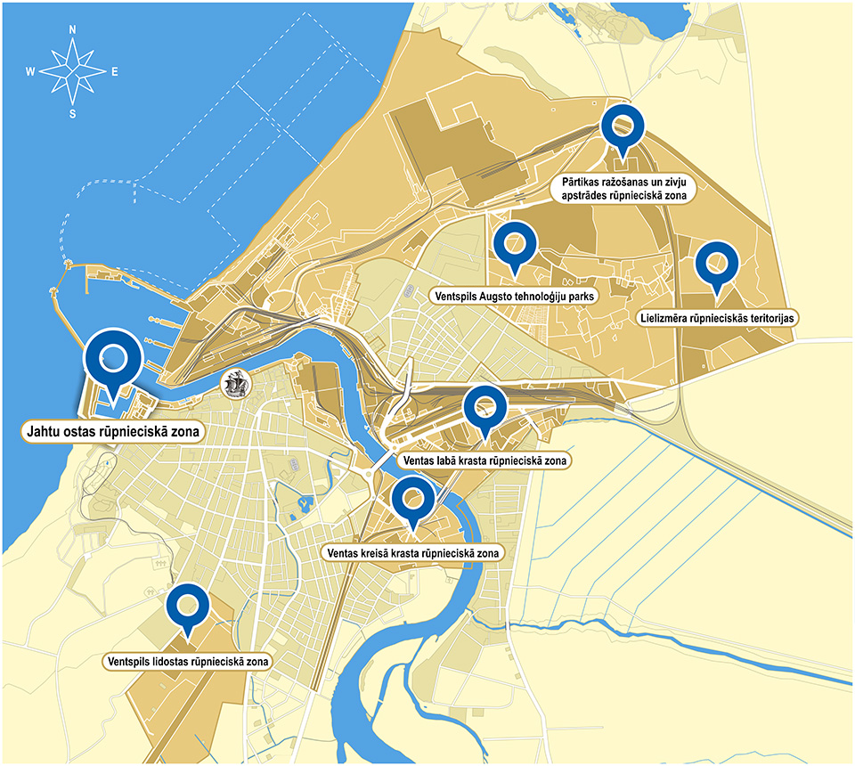 Ventas kreisā krasta rūpnieciskajā zonā darbojas dažādu produktu ražojošie uzņēmumi. Tā atrodas pilsētas centrālajā daļā 5 minūšu braucienā no Ventspils ostas un ~ 2 stundu braucienā no galvaspilsētas Rīgas un Starptautiskās lidostas Riga (RIX).