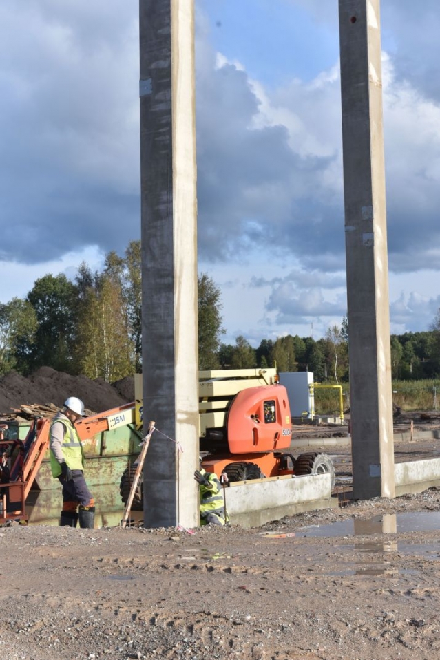 Сейчас ведётся монтаж железобетонных колонн и металлоконструкций здания № 6 ВПВТ, в т. ч. кровельной конструкции. В конце октября планируется приступить к монтажу панелей сэндвичного типа и несущих металлические профилей крыши, а к зиме будет уложено кровельное покрытие, – рассказывает помощник руководителя работ ООО Остас целтниекс Матис Гутманис.