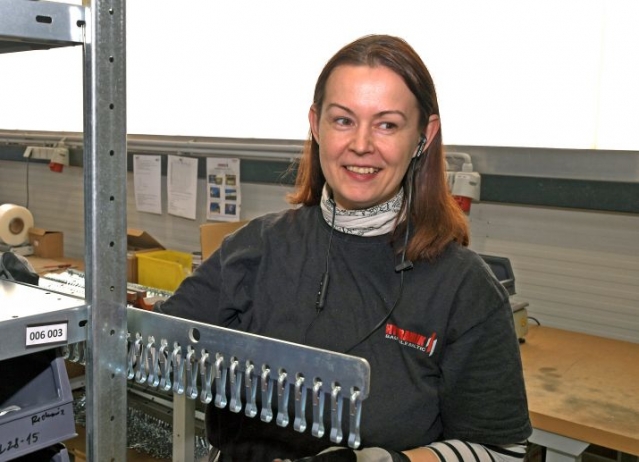 Photo: The warehouse manager Anda Haldimane-Trulevica is responsible for handing out and exporting goods to the customers. She does not think that her work is un-feminine. She worked as a salesperson abroad for nine years and claims she likes this job more. In the photo: Anda is assembling an order for Bucher Municipal.