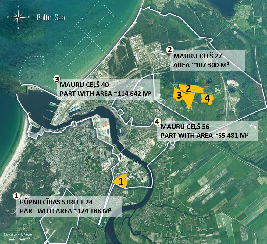 - land plot at 27, Mauru Ceļs, Ventspils (cad. No 2700 033 0209) with area of 107 300 m2;