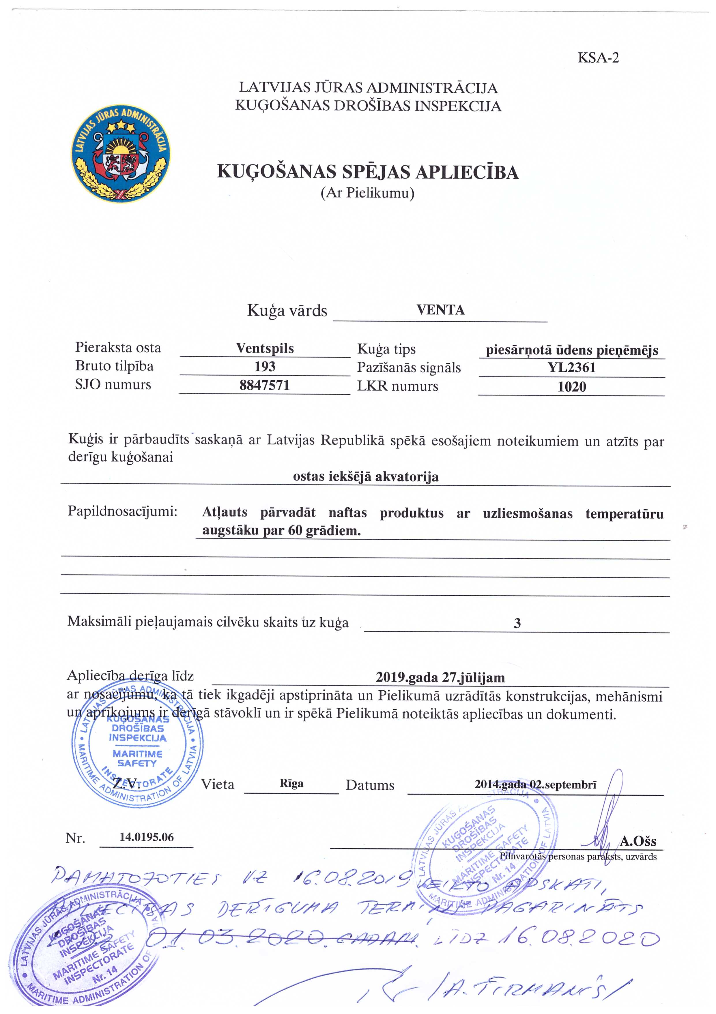 Reģistrācijas apliecība (dokuments publicēts 22.09.2020)Kuģošanas spējas apliecība (dokuments publicēts 22.09.2020)5.pielikums (dokuments publicēts 22.09.2020)4.pielikums (dokuments publicēts 22.09.2020)3.pielikums (dokuments publicēts 22.09.2020)2.pielikums (dokuments publicēts 22.09.2020)1.pielikums (dokuments publicēts 22.09.2020)Nolikums (dokuments publicēts 22.09.2020)