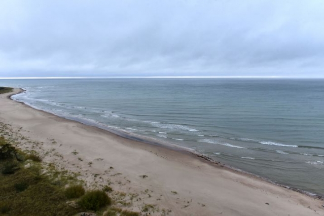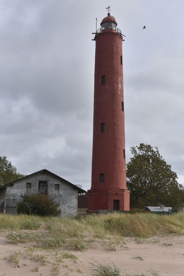 Akmeņraga bākas sarkanais mūra tornis gaumīgi kontrastē ar apkārtējo ainavu.