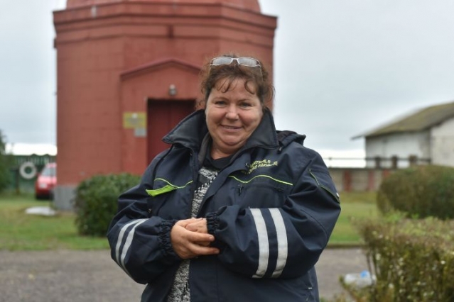 Viesmīlīgā Akmeņraga bākas uzraudze Tatjana Vešņakova apmeklētājus sagaida ar smaidu.