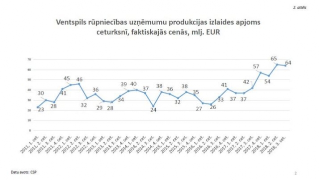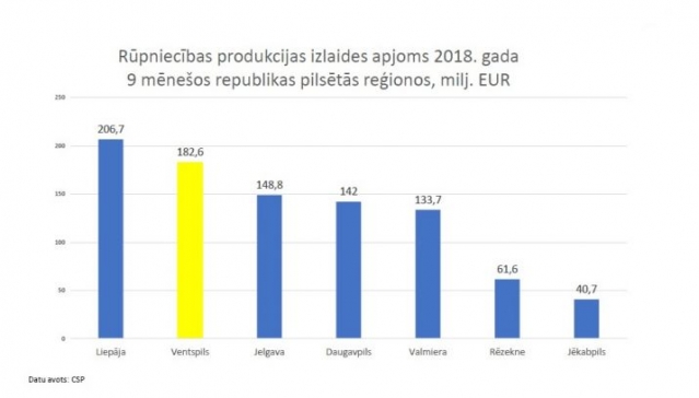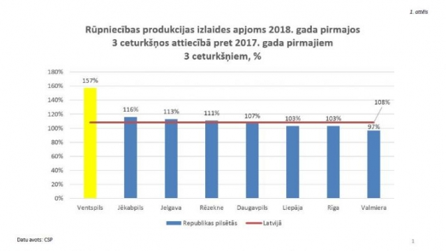 Pēc Centrālās statistikas pārvaldes datiem, šogad deviņu mēnešu laikā Ventspilī sasniegts Latvijā visaugstākais saražotās rūpnieciskās produkcijas pieaugums – par 57%, salīdzinot ar 2017. gada trīs ceturkšņu līmeni. Vidēji Latvijā saražotais rūpnieciskais apjoms tajā pašā laika posmā ir palielinājies par 8%. Pēc rūpnieciskās produkcijas attīstības tempiem Ventspils ir stabila līdere starp Latvijas pilsētām: Jēkabpilī šis pieaugums ir 16%, Jelgavā – 13%, Rēzeknē – 11%, Daugavpilī – 7%, Liepājā un Rīgā – 3%, Valmierā šogad tiek novērots saražotās rūpnieciskās produkcijas apjoma samazinājums, salīdzinot ar pagājušo gadu.