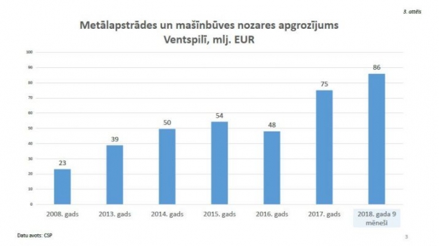 Faktiskajās cenās tas produkcijas apjoms, kādu šogad saražojuši visi Ventspils rūpnieciskie uzņēmumi, ir 183 miljoni eiro. Tas ir Ventspils industriālās attīstības perioda rekordapjoms. Īpaši strauji attīstās metālapstrādes un mašīnbūves nozare. Visu šīs nozares uzņēmumu summārais apgrozījums deviņu mēnešu laikā sasniedzis 86 miljonus eiro. Salīdzinājumam: 2017. gadā saražotās mašīnbūves un metālapstrādes produkcijas apgrozījums sasniedza 75 miljonus eiro, 2016. gadā – 48 miljonus eiro.