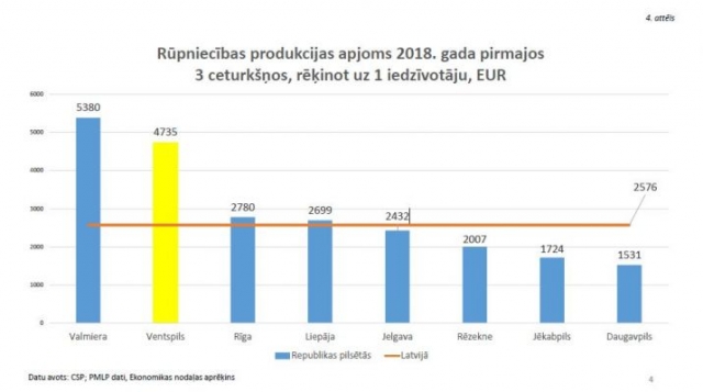 Rēķinot uz vienu iedzīvotāju, Ventspilī saražotā rūpnieciskā produkcija sasniedz 4735 eiro. Pēc šī rādītāja esam otrajā vietā Latvijā, piekāpjoties tikai Valmierai. Vidēji Latvijā saražotās rūpnieciskās produkcijas apjoms uz vienu iedzīvotāju šā gada trīs ceturkšņos veidoja 2576 eiro. Zem vidējā Latvijas līmeņa pēc šī rādītāja bija Jelgava, Rēzekne, Jēkabpils un Daugavpils. Pēc rūpnieciskās produkcijas saražotā apjoma faktiskajās cenās Ventspils starp republikas pilsētām arī ir otrajā vietā – pēc Liepājas.