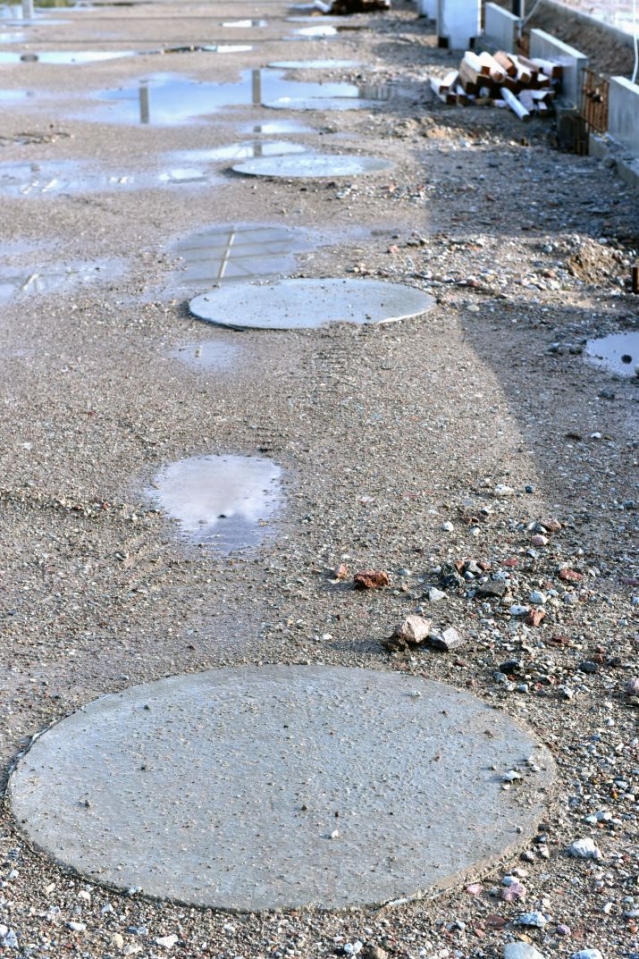 Viscaur VATP būvlaukumā nr. 6 redzamas apaļas dzelzsbetona plāksnes. Zem tām izvietoti 12 m gari pāļi, kuru uzdevums būs pastiprināt grīdas nestspēju.