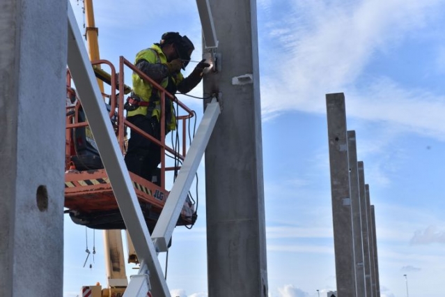 Strādnieks nostiprina stinguma saites, kas savieno dzelzsbetona kolonnas, lai ēka vēja, sniega vai citu dabas spēku ietekmē nemainītu savu ģeometrisko stāvokli. Saites nodrošinās ēkas stabilitāti.