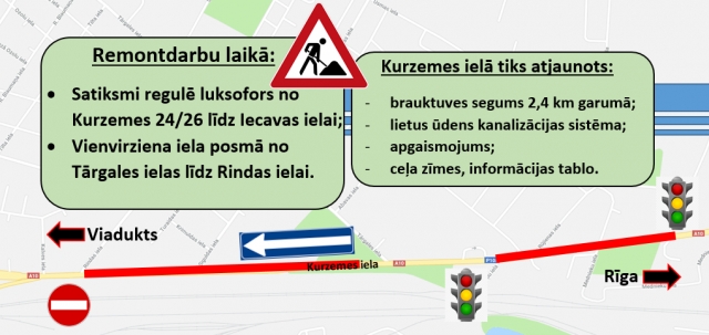 Šodien, 29.augustā, ir uzsākta Kurzemes ielas pārbūve posmā no Mazās Kurzemes ielas līdz Embūtes ielai Ventspilī. Būvdarbi Kurzemes ielā tiks veikti divos posmos, ietverot satiksmes ierobežojumus, - posmā no Kurzemes ielas 24/26 līdz Iecavas ielai satiksmi organizēs luksofori, savukārt no Tārgales ielas līdz Rindas ielai satiksme būs atvērta tikai vienā virzienā – virzienā uz viaduktu. No viadukta virziens uz Rīgu remontdarbu laikā būs slēgts. Aicinām iedzīvotājus sekot līdzi satiksmes izmaiņām, atvainojamies par sagādātajām neērtībām.