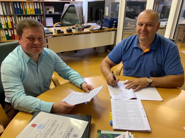 SIA Aquatoria V valdes priekšsēdētājs Viktors Šports (no labās) ieradies uz tikšanos ar Ventspils brīvostas pārvaldnieka vietnieku Igoru Udodovu, lai parakstītu līgumu ar Ventspils brīvostas pārvaldi.