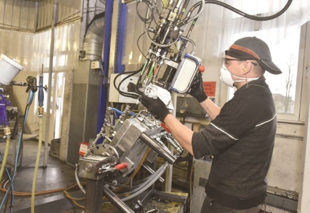 Оператор заливает жидкую пластмассу в пресс-форму. Через несколько минут он извлечёт готовое изделие. За день из одной пресс-формы может выйти до 190 пластмассовых деталей.