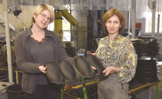 Алиция Воронецка (справа) и Кетия Бойтмане демонстрируют готовую деталь, только что вышедшую из пресс-формы.