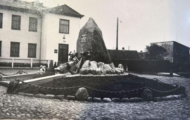 Памятник морякам и рыбакам, покоящимся в морской пучине. На заднем плане – не сохранившееся до наших дней здание правления Вентспилсского порта, а справа можно разглядеть урну для сбора пожертвований (конец 30-х, начало 40-х годов).