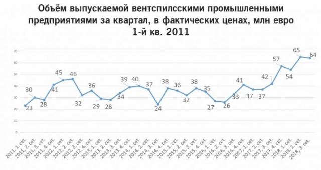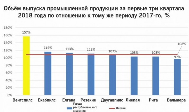 По данным Центрального статистического управления, в этом году за 9 месяцев в Вентспилсе достигнут самый высокий в Латвии прирост выпуска промышленной продукции – на 57%, в сравнении с уровнем трёх кварталов 2017 года. В среднем по Латвии выпуск промышленной продукции за это же время вырос на 8%. По темпам развития промышленного производства Вентспилс уверенно лидирует среди городов Латвии: в Екабпилсе прирост составил 16%, в Елгаве – 13%, в Резекне – 11%, в Даугавпилсе – 7%, в Лиепае и Риге – по 3%, в Валмиере в этом году наблюдается снижение промышленного производства, по сравнению с прошлым годом.