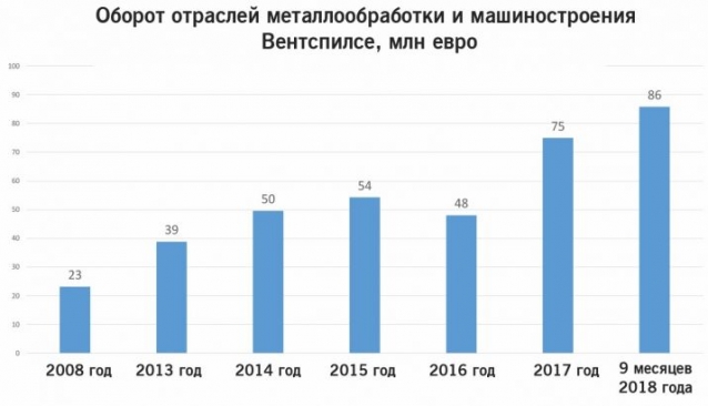 В фактических ценах объём продукции, выпущенной в этом году всеми промышленными предприятиями Вентспилса, составил 183 млн евро. Это рекордный объём для Вентспилса за весь период индустриального развития. Особенно стремительно развивается металлообрабатывающая и машиностроительная отрасль. Суммарный оборот всех предприятий этой отрасли за 9 месяцев достиг 86 млн евро. Для сравнения: за весь 2017 год выпущено продукции машиностроения и металлообработки на 75 млн евро, в 2016 году – на 48 млн евро.
