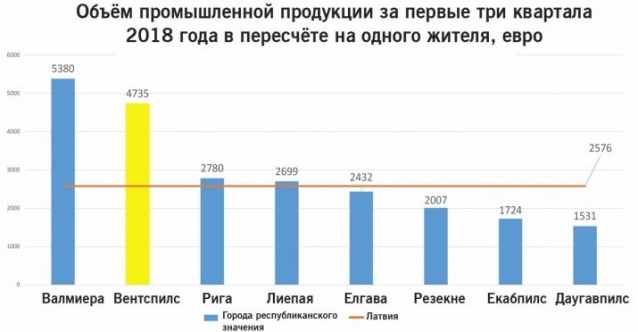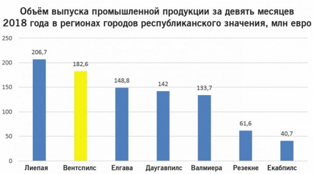 В расчёте на одного жителя в Вентспилсе выпущено промышленной продукции на 4 735 евро. По этому показателю мы занимаем второе место в Латвии, уступив только Валмиере. В среднем по Латвии выпуск промышленной продукции на одного жителя составил за три квартала этого года 2 576 евро. Ниже среднелатвийского уровня по этому показателю оказались Елгава, Резекне, Екабпилс и Даугавпилс. По объёму выпуска промышленной продукции в фактических ценах Вентспилс среди республиканских городов также на втором месте – после Лиепаи.