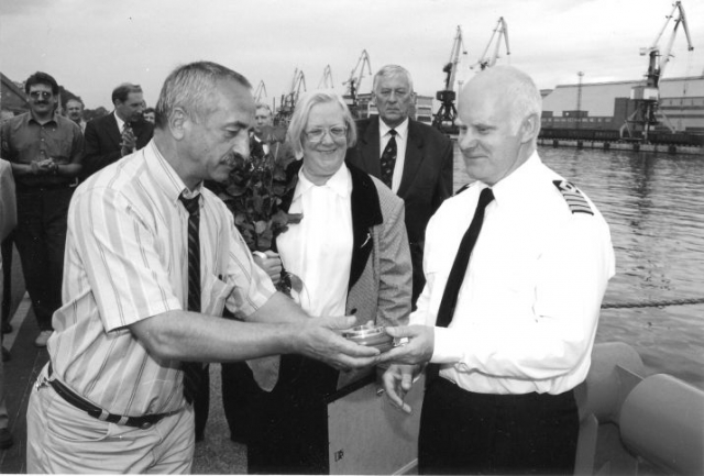 В 2000 году капитан Вилис Зилниек (справа) пригнал из Голландии в Вентспилс новый буксир Вентспилс и получил от помощника управляющего портом Гунтиса Тирманиса в подарок барометр. На фото также – крёстная буксира историк Ингрида Штрумфа.
