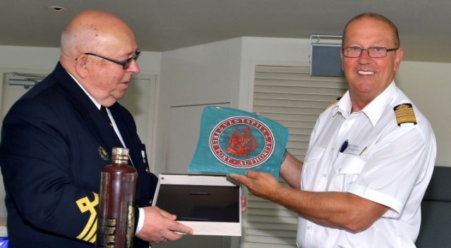 Капитан Вентспилсского свободного порта Арвид Бук вручает капитану круизного лайнера AmadeaАрне Эрнстсену портовый памятный знак, а также традиционные латвийские сувениры и бутылку Рижского чёрного бальзама. Это часть традиции при первом заходе судна в порт. Представители обеих сторон выразили надежду, что встреча не станет последней.